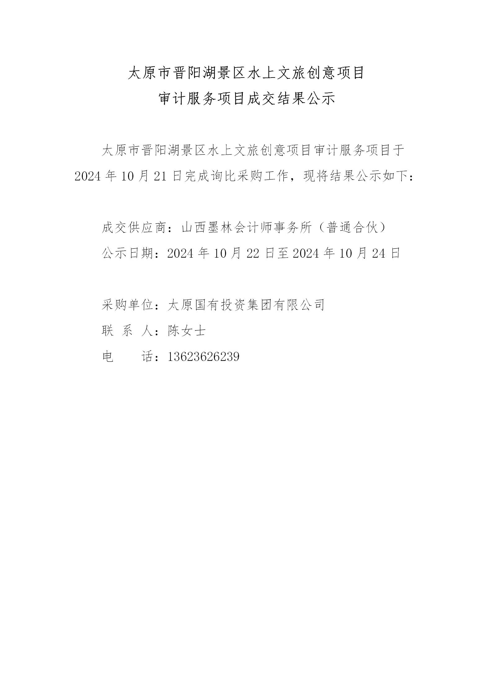 太原市晉陽湖景區(qū)水上文旅創(chuàng)意項目審計服務(wù)詢比成交結(jié)果公示