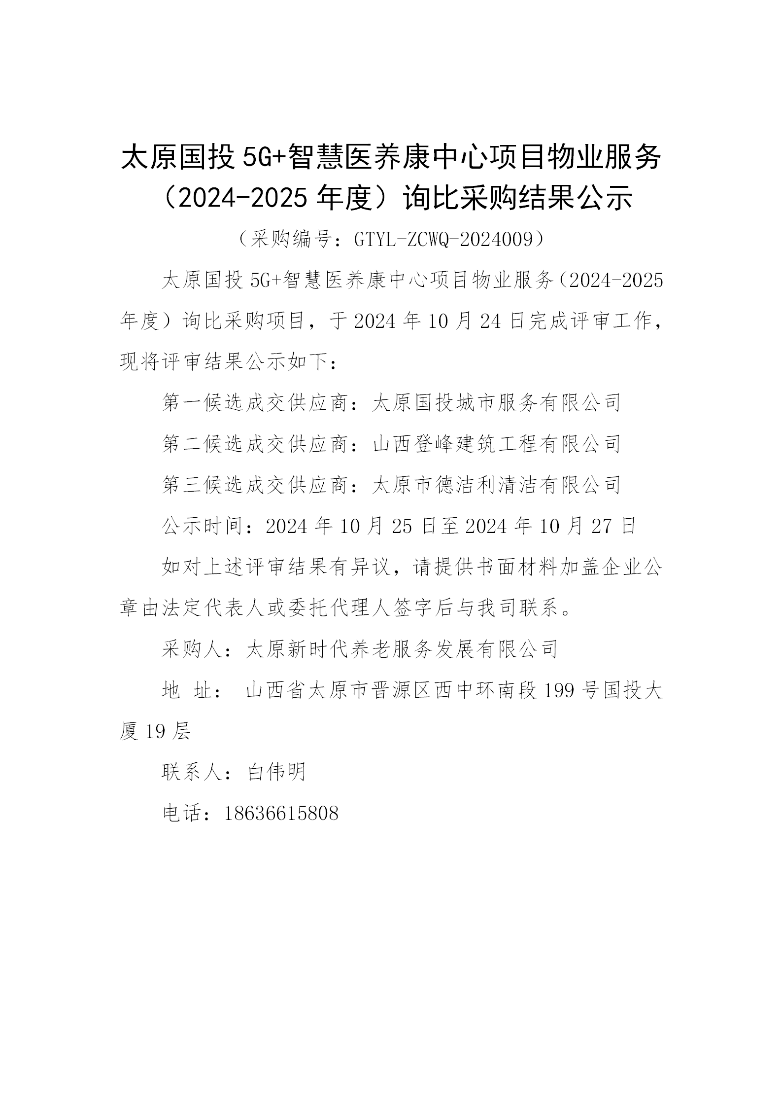 太原國投5G+智慧醫(yī)養(yǎng)康中心項目物業(yè)服務(wù)(2024-2025年度)詢比采購結(jié)果公示