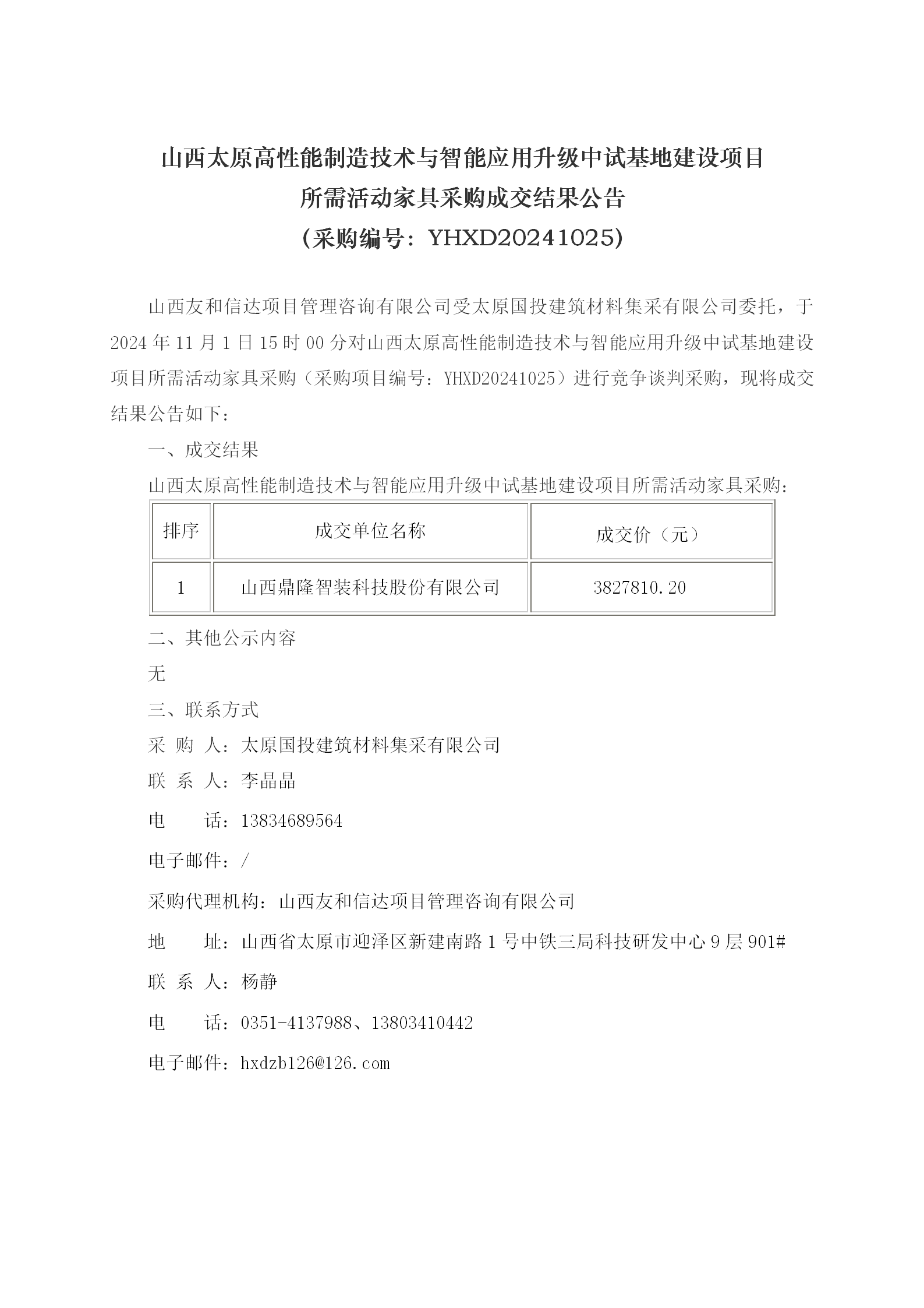山西太原高性能制造技術(shù)與智能應(yīng)用升級(jí)中試基地建設(shè)項(xiàng)目所需活動(dòng)家具采購成交結(jié)果公告