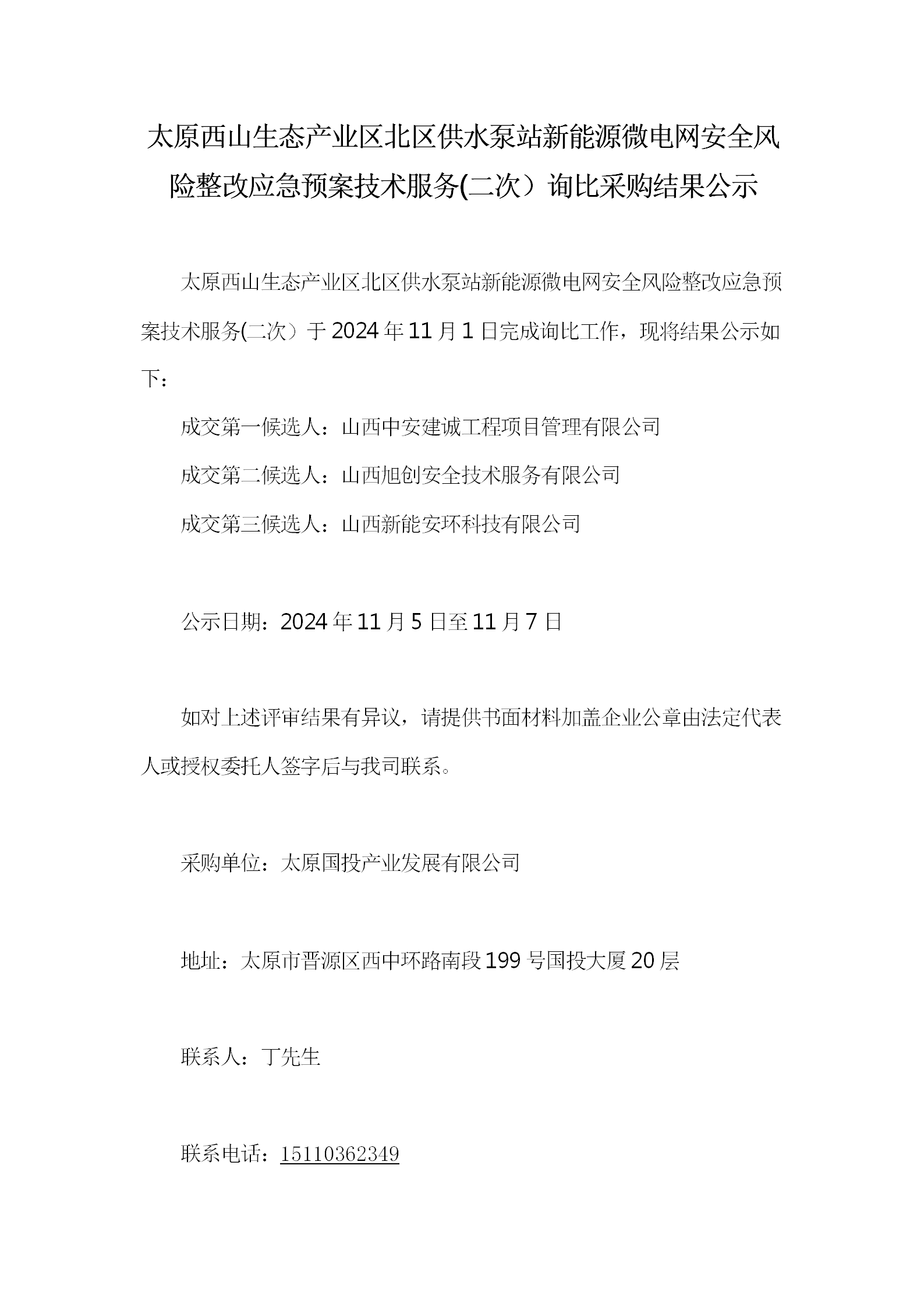 太原西山生態(tài)產(chǎn)業(yè)區(qū)北區(qū)供水泵站新能源微電網(wǎng)安全風(fēng)險(xiǎn)整改應(yīng)急預(yù)案技術(shù)服務(wù)(二次)詢(xún)比采購(gòu)結(jié)果公示