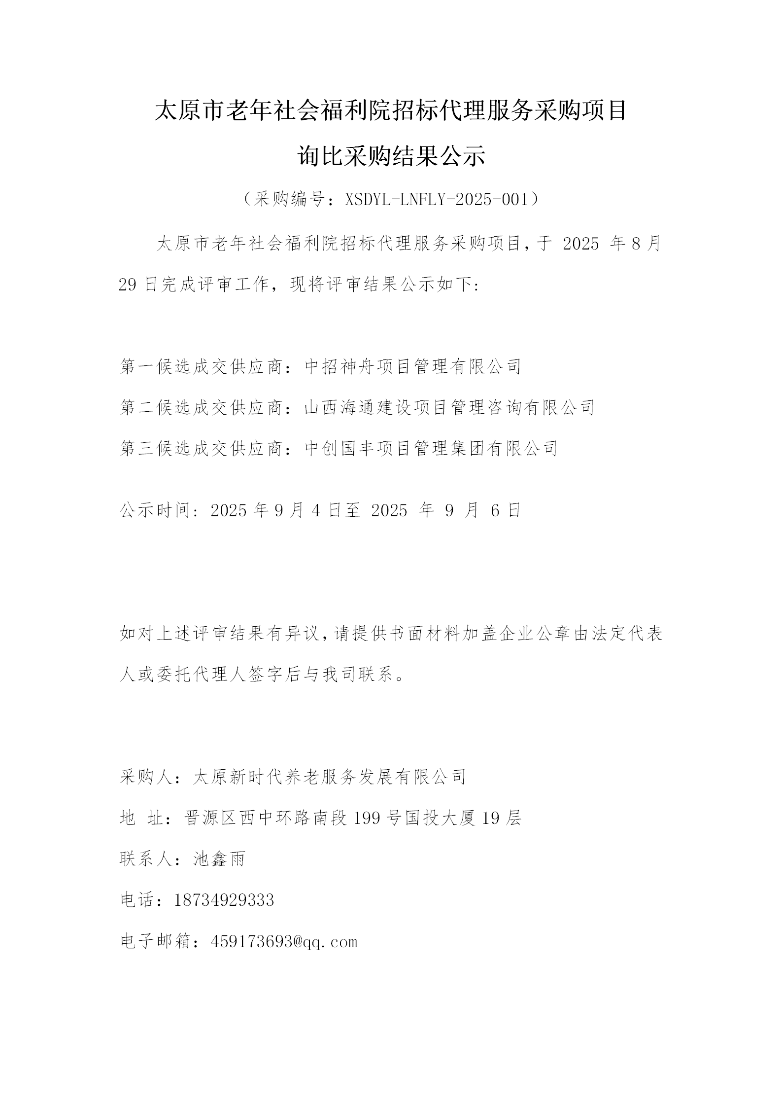 太原市老年社會福利院招標(biāo)代理服務(wù)采購項目詢比采購結(jié)果公示