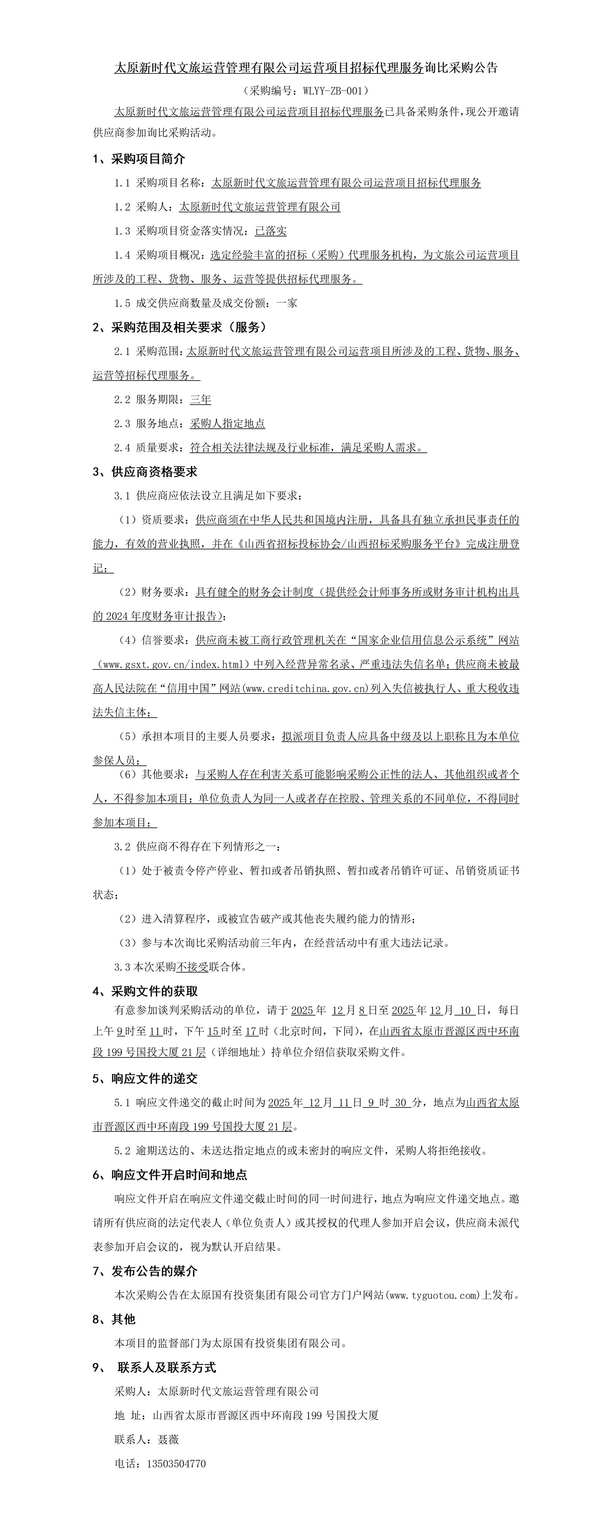 太原新時(shí)代文旅運(yùn)營(yíng)管理有限公司運(yùn)營(yíng)項(xiàng)目招標(biāo)代理服務(wù)詢比采購(gòu)公告