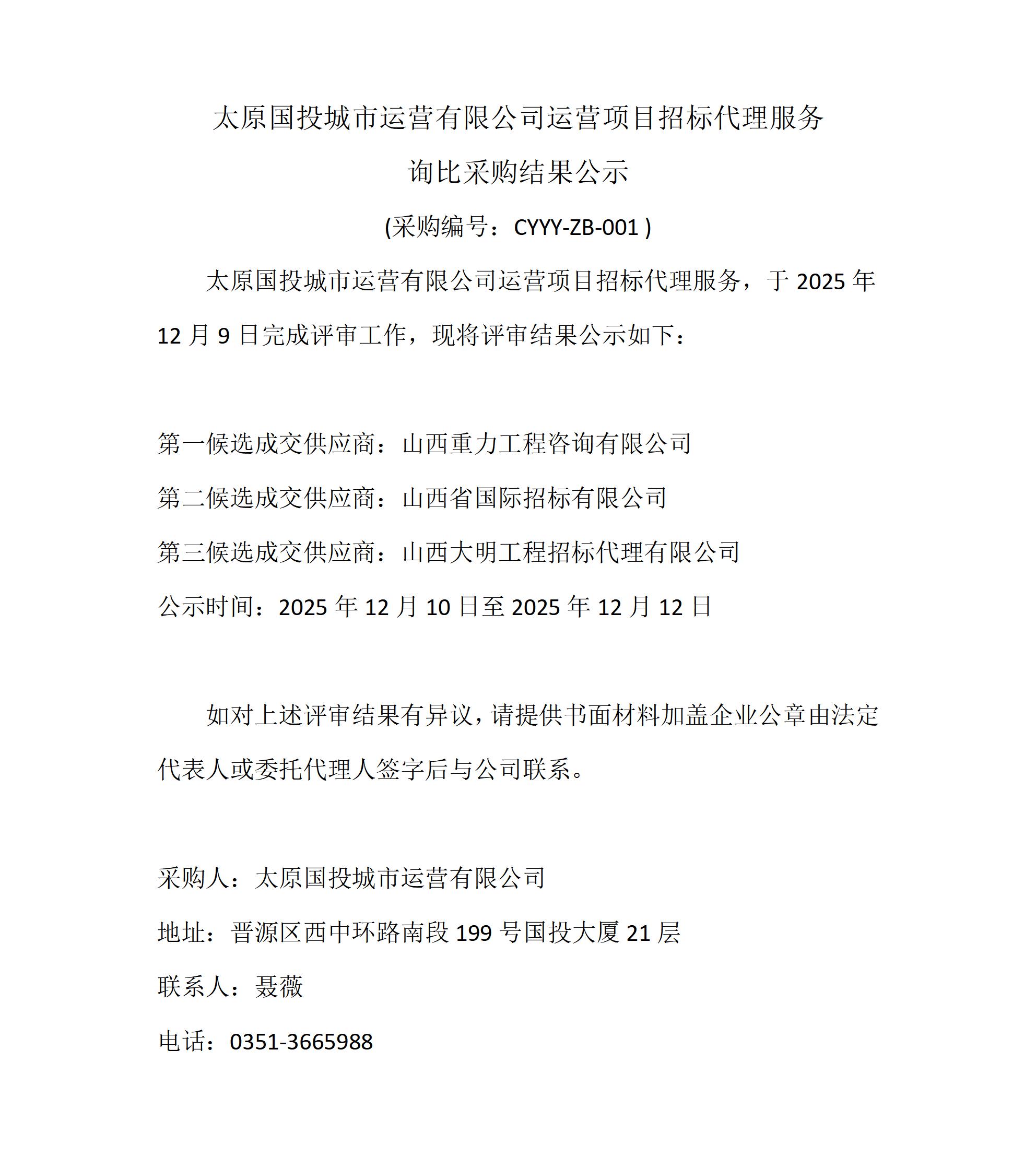 太原國投城市運(yùn)營有限公司運(yùn)營項(xiàng)目招標(biāo)代理服務(wù)采購項(xiàng)目詢比采購結(jié)果公示