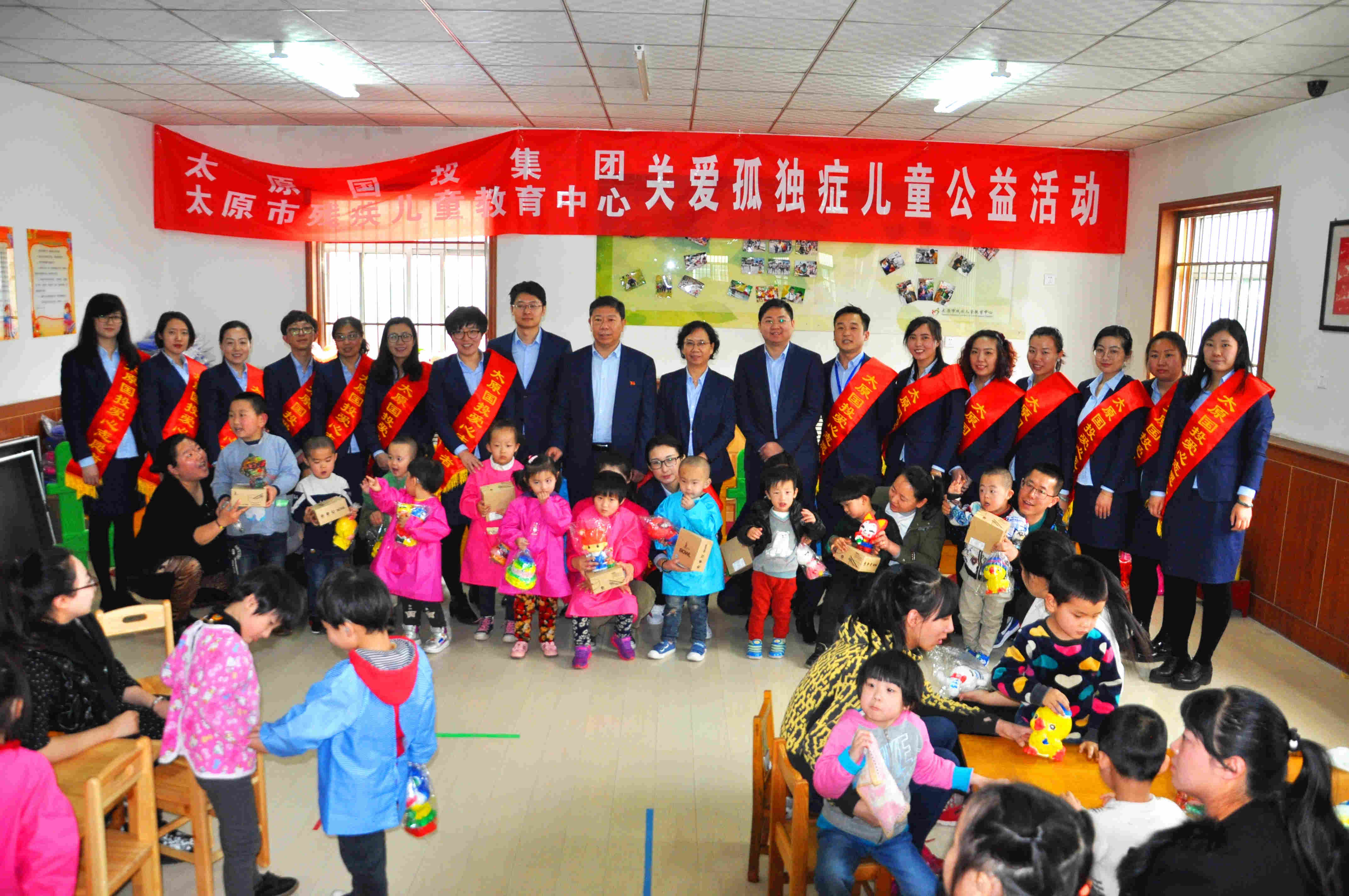 2017年3月30日上午,在第十個“世界自閉癥日”來臨前夕,太原國有投資集團有限公司的愛心志愿者們來到太原市殘疾兒童教育中心,與中心共同開展“關(guān)愛孤獨癥兒童公益活動”,為這里的兒童們送來平板電腦、書包、油畫棒和繪本等價值2.5萬元的玩教具。